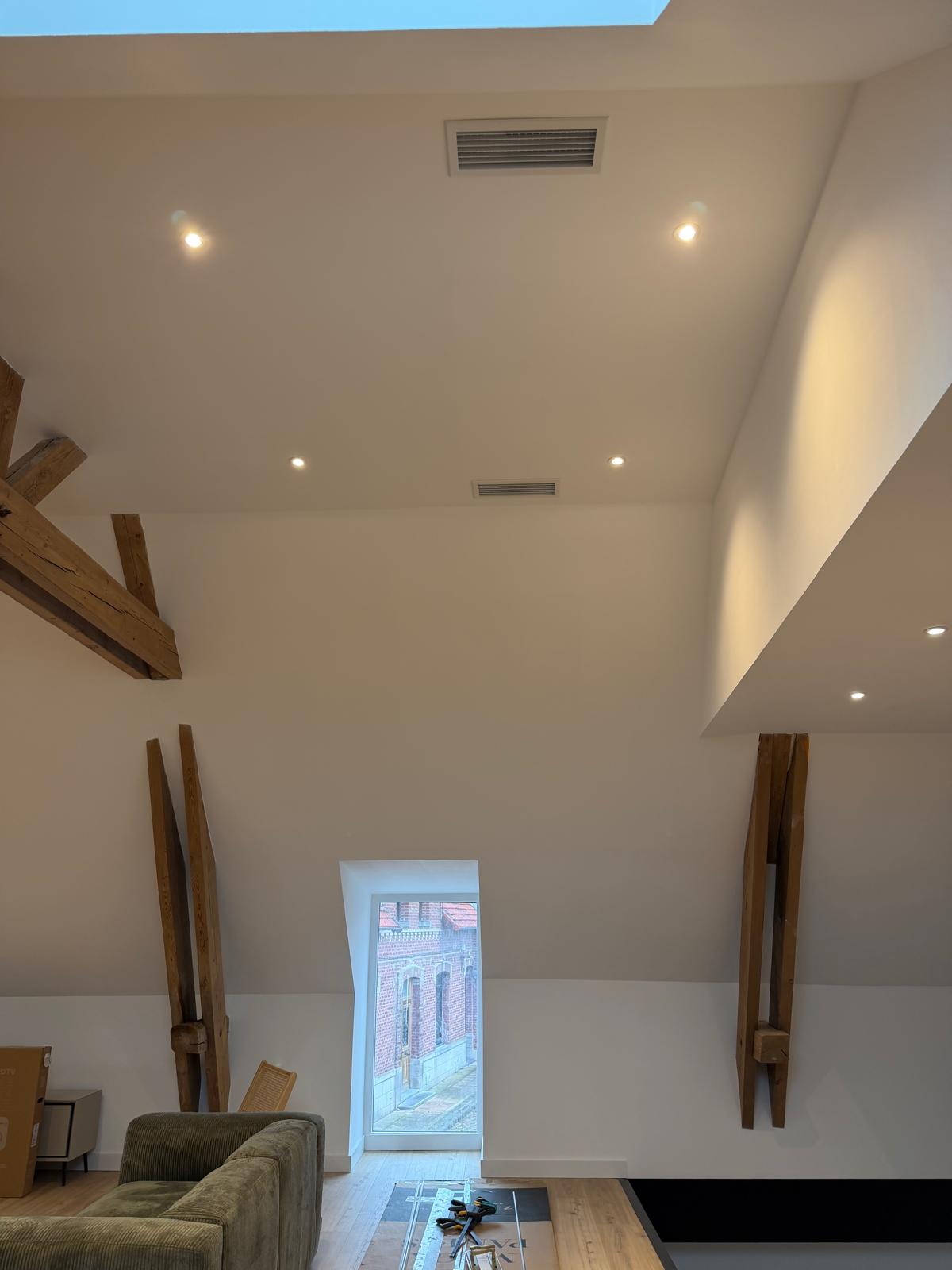Intégré dans les combles ou les faux plafonds, le système gainable diffuse la chaleur via des grilles au plafond, sans unités murales visibles, pour un rendu esthétique et moderne.
